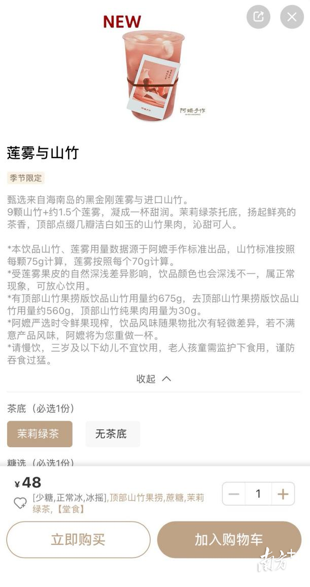 据阿嬷手作官方介绍,这款“莲雾与山竹”饮品甄选来自海南岛的黑金刚莲雾与进口山竹,每杯含9颗山竹与约1.5颗莲雾鲜果。其中,顶部30克山竹果捞的成本就达10元。此外,加上手工切配、现制现售的工艺要求,推高了单品原料与人工成本。