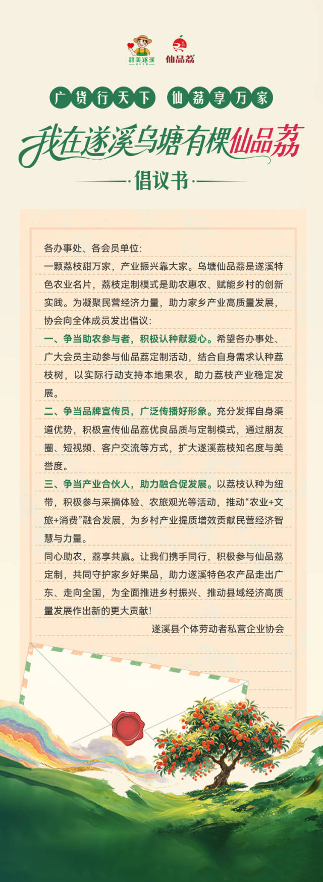 为进一步扩大仙品荔品牌影响力,助力荔农增收致富,推动农文旅融合发展,遂溪县个体劳动者私营企业协会特向各办事处、全体会员单位发出如下倡议: