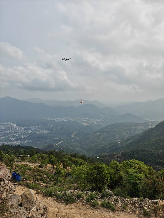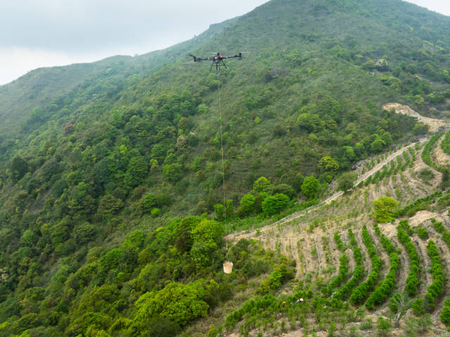 毕业后,韦镇辉毅然返乡,用创业补贴和兼职积蓄购置了第一台极飞农业无人机。他先在自家茶园做试验,依托极飞无人机的北斗高精度导航与 RTK 技术,针对山地气流复杂、作业路径多变的特点反复调试参数,优化飞行路线。经过反复试验,他终于摸索出一套适合高山茶园的作业模式。如今,这架无人机一次可吊运 70公斤茶青,往返仅需 2分钟,是摩托车运输效率的 10 倍,且能全天候作业,不受山路条件限制。