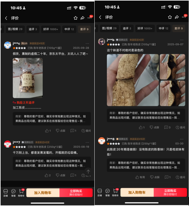 能窥见真相的,是商品评价页面。在这里,不少消费者晒出了收到的产品包装照片,差评触目惊心:“都是发黑发霉的”“这个味道不对,绝对是染色的”“假货、熏制的虚假二十年”。