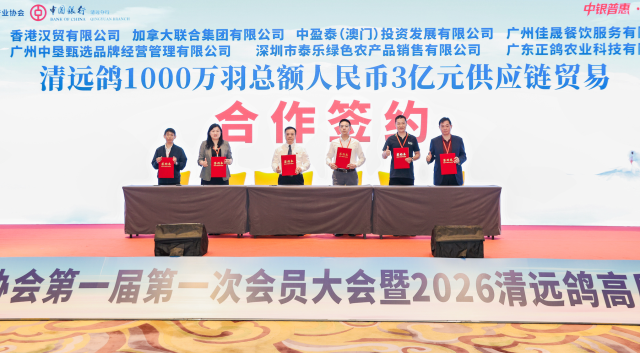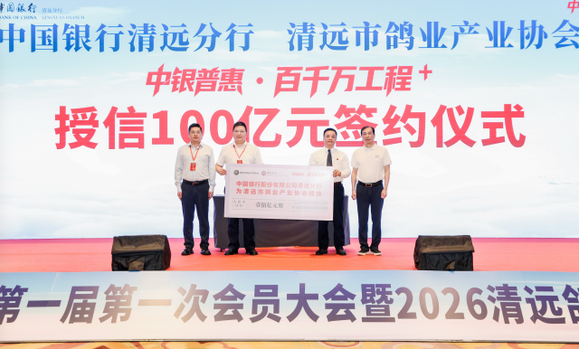 金融活水精准滴灌成为本次大会最大亮点。清远市鸽业产业协会与中国银行清远分行签署战略合作协议,中国银行清远分行整体授信人民币100亿元,专项用于支持会员企业在种鸽繁育、鸽舍标准化改造、冷链物流建设、品牌营销等环节的融资需求。这是清远农业领域迄今获得的单笔最大额度银行授信,将有效破解鸽企 "融资难、融资贵" 瓶颈。