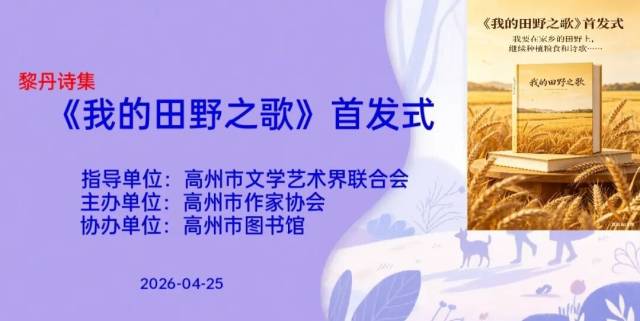 稻田炊烟,乡土情怀,4月25日,由高州市文学艺术界联合会指导、高州市作家协会主办的黎丹诗集《我的田野之歌》首发式暨新书分享会,在高州市区举行。来自文联、作协及教育界的众多文朋诗友齐聚一堂,共同见证这部扎根粤西泥土、讴歌田园生活的诚意之作的面世。