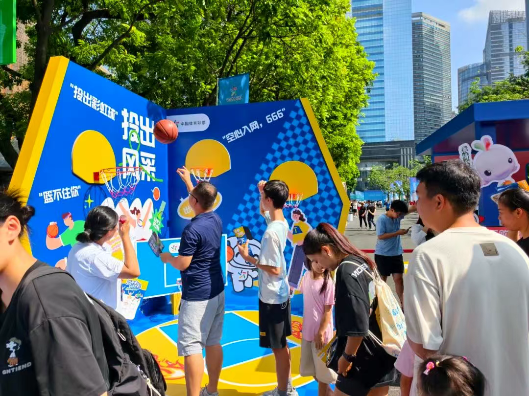 体彩主题活动通过活泼的色彩元素、有趣的运动游戏、精美的体彩周边礼品,打造了一个专属体彩的健康运动场和快乐公益场。摊位内设置了多项趣味运动体验项目,不仅生动展现了体彩在体育强国建设中的积极作为,更成功吸引了广大市民踊跃参与。在投出风采(篮球)、神采飞扬(跳远)、PING得出彩(乒乓球)、脑动动出彩(足球)、哐动时刻(保龄球)等趣味运动项目区,现场加油声、欢笑声此起彼伏,充分展现了全民健身的蓬勃生机。