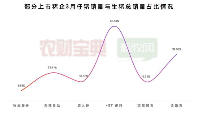 仔猪价格走俏,上市猪企们也在持续加大仔猪抛售力度。《农财智库》数据显示,正邦3月仔猪销量占生猪总销量的63.14%,金新农也已近40%。与此同时,牧原股份和唐人神3月仔猪销量比去年同期增长了124.9%和98.74%。