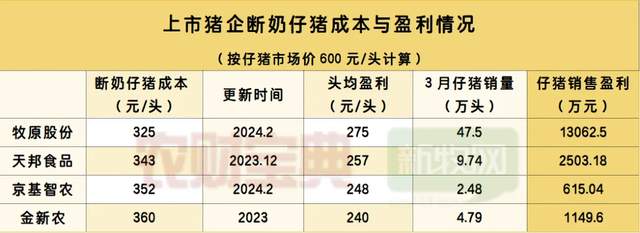 以断奶成本最低的牧原股份为例,断奶仔猪头均盈利可达275元,3月仅仔猪就贡献了1.3亿多元的盈利。牧原股份表示,公司仔猪销售主要受市场需求影响,近期仔猪销售价格有所上涨,公司仔猪销量有一定增加,未来公司会根据客户需求及市场行情综合决策仔猪销售。