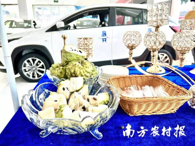 本次湛江释迦果亮相广汽丰田威飒新车发布会推介活动由湛江市双双赢农业有限公司(下文称“双双赢”)和湛江市赤坎区瀚龙车城广汽丰田骏诚椹川北店共同策划。威飒是广汽丰田旗下的高端豪华新车型,“贵族水果”释迦果借此新车发布会契机,聚焦圈定高端客群和消费场景,实现精准营销,“这次活动市场反应很热烈,不少消费者现场品尝后就马上下单了!”双双赢种植基地负责人梁生说。