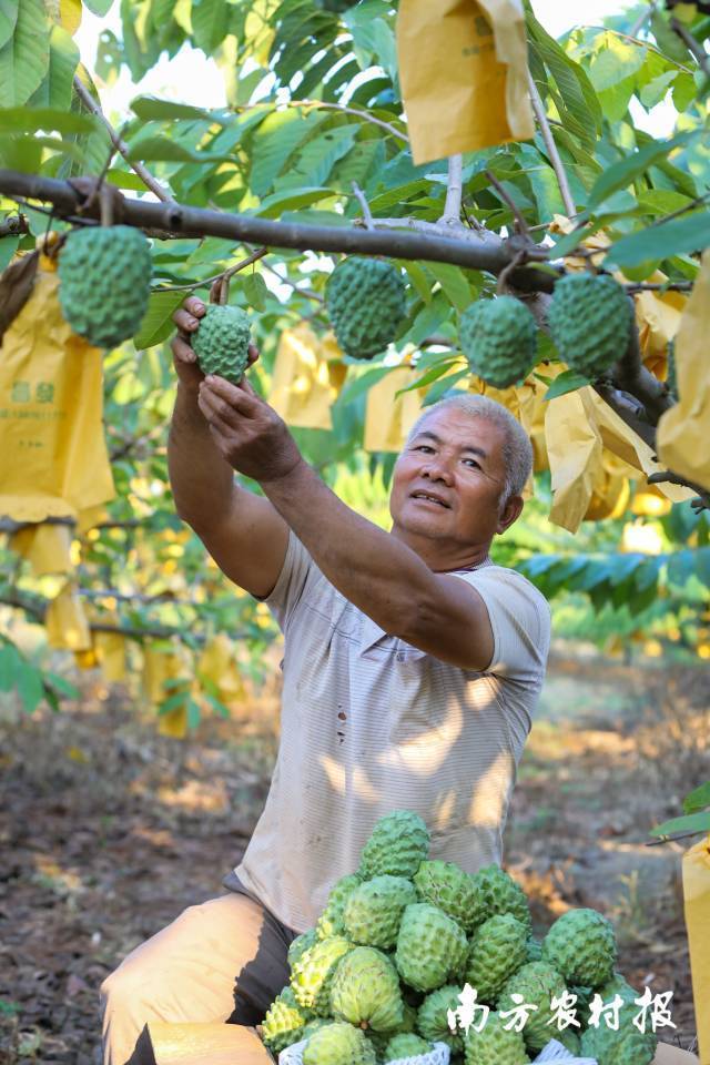 释迦果原产南美,在大陆地区还没有进行大面积种植。目前,双双赢是广东省内最大的释迦果种植基地,面积近千亩,产量超100百万斤,产值超2000万元,是湛江市重点龙头企业。据梁生介绍,土壤肥沃、光热条件优越的湛江,对热带水果释迦果而言是种植佳地,湛江释迦果口感好、品质高,收购价从15元/斤涨到20元/斤,比去年同期上升了30%。