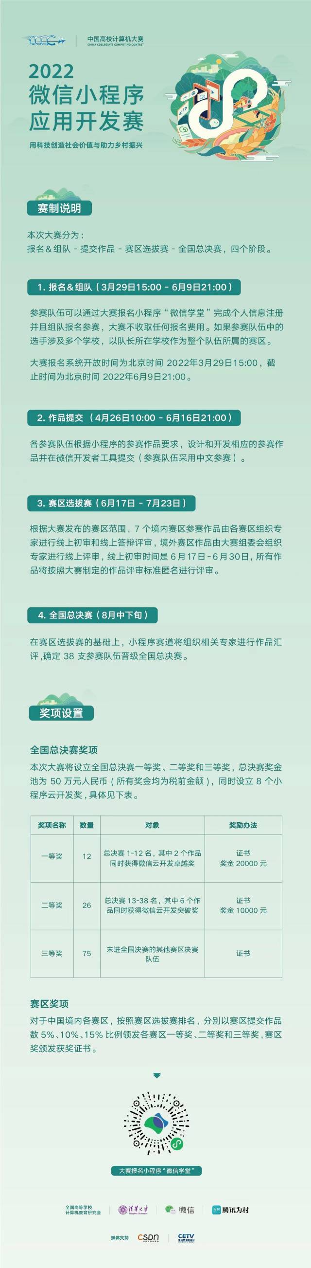 3月29日,2022年中国高校计算机大赛——微信小程序应用开发赛(以下简称“大赛”)正式启动,本届大赛聚焦“用科技创造社会价值与助力乡村振兴”主题,只要你是在校生或者2021年1月1日之后毕业的学生,即可通过大赛报名小程序“微信学堂”完成个人信息注册并组队报名参赛,通过开发微信小程序应用,一起为乡村振兴出力!
