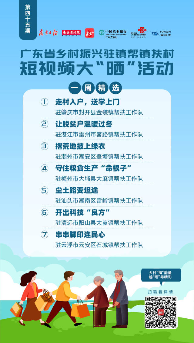 以“乡村‘镇’能量,越‘晒’粤精彩”为主题的广东省乡村振兴驻镇帮镇扶村短视频大“晒”活动于2022年2月全面启动。活动在南方+APP开辟专区,鼓励各驻镇帮扶工作队比“晒”行动做法、成效亮点、实事好事。主办方每周将精选出部分优秀参“晒”作品进行展播。无论是晒工作经验做法,还是秀驻镇风采人物趣事,均有机会上榜驻镇帮镇扶村短视频大“晒”一周精选,敬请垂注!