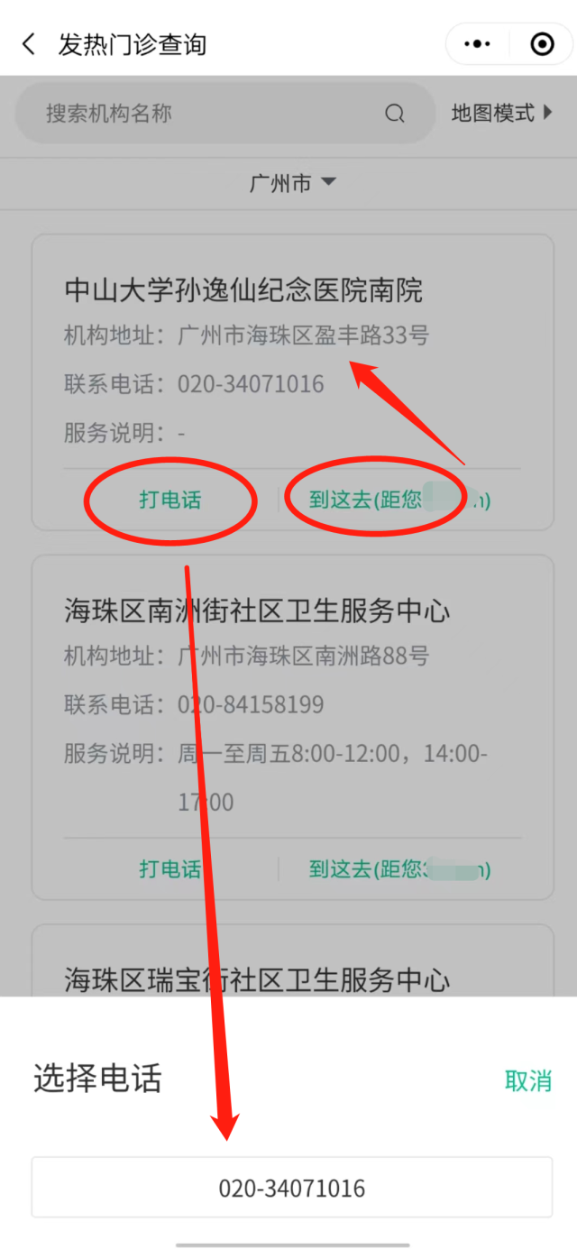 发热门诊是医院的抗“疫”前线,为满足不同人群发热就诊需求,发热门诊电子地图同时支持按地市筛选、搜索机构名称、就近原则排序、地图模式展示等使用模式。另外,居民如要咨询发热用药、开诊时间等信息,可点击“打电话”按钮,一键拨打相应发热门诊(诊室)电话咨询。