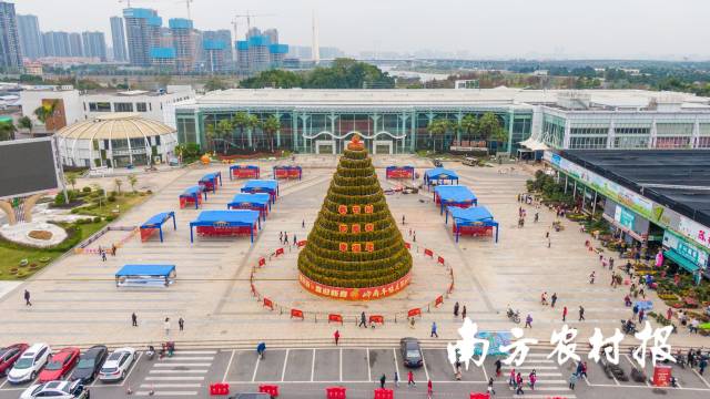 1月8日,记者在佛山市顺德区陈村花卉世界的中心广场现场看到,这座高达16.8米的世界最高最大年桔塔已悄然落成。不久后,这棵高大的年桔塔将在1月11日举办的2023广东迎春网络年货节暨“云上花市”启动仪式、第39届陈村迎春花市中正式亮相,吉迎八方花客。