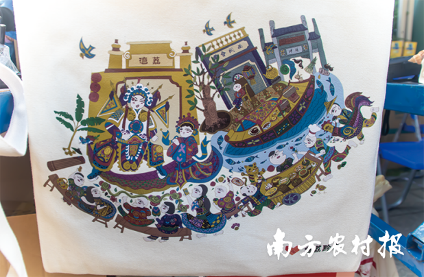 发展文化产业,是带动帮扶地区实现共同富裕的可行途径之一。在广州市荔湾区对口帮扶下,贵州龙里和惠水地区创新研发文创产品,将当地非遗文化融入实际生活应用,打造“魅荔黔南”品牌非遗产品。“环保袋上的图案是贵州龙里平坡农民画的,图案样式有两种,一种以贵州为主,当客人来到贵州,当地人民便会穿上传统服饰,伴着喜庆热闹的民乐欢歌起舞。另一种则以荔湾为主,展现广州的骑楼建筑、粤剧、传统乐器、特色小吃等。”何先生热情地介绍道。