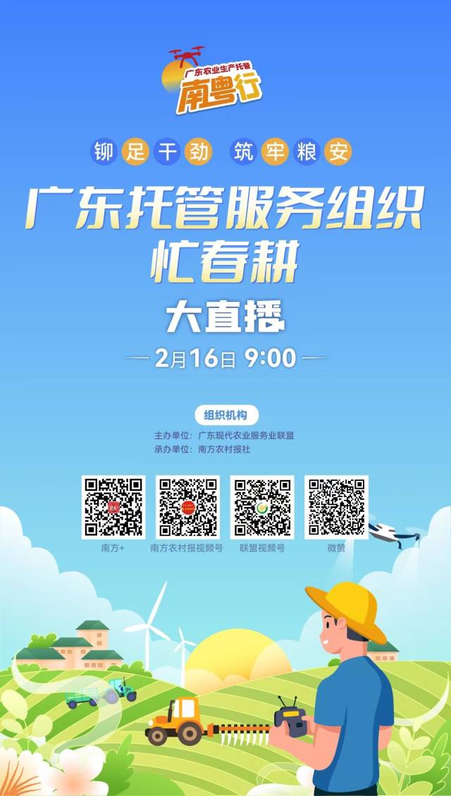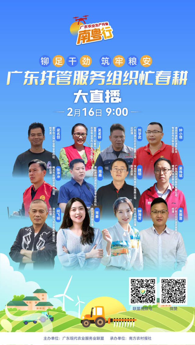 铆足干劲,筑牢粮安。2月16日上午9点,由广东现代农业服务业联盟主办,南方农村报社承办的广东托管服务组织忙春耕大直播活动即将举行。活动将连线十家托管服务组织,深入全省各地田间地头,了解春耕备耕一线生产活动,展现托管服务组织的发展现状和趋势。