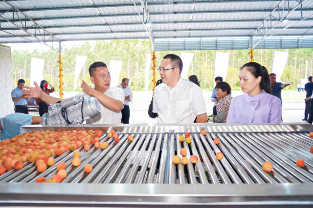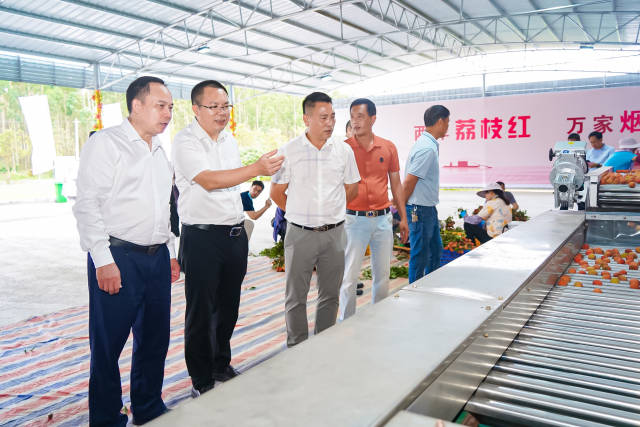 湛江市农业农村局副局长冯忠志(左)、遂溪县委常委、副县长庞宇(中)听取湛川村支部书记、遂溪县湛川河谷荔枝种植专业合作社社长黄民军汇报荔枝分级工作