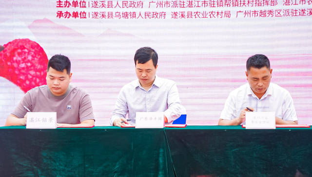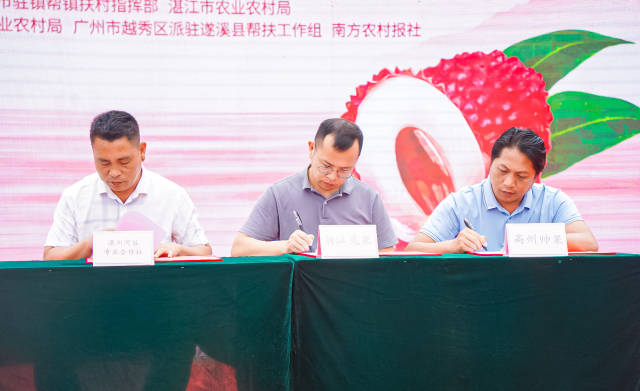 发布会现场进行了“销售帮扶 有您有荔”2023仙品荔销售签约仪式。湛江市铭景农业发展有限公司签约代表公司法人陈家荣、广东泽丰园农产品有限公司签约代表公司副总经理谢立佳、浙江觅果农业科技有限公司签约代表副总经理江树锋、高州市帅果农业发展有限公司签约代表公司创始人陈小敏与遂溪县湛川河谷荔枝种植专业合作社签约代表合作社社长黄民军进行签约。