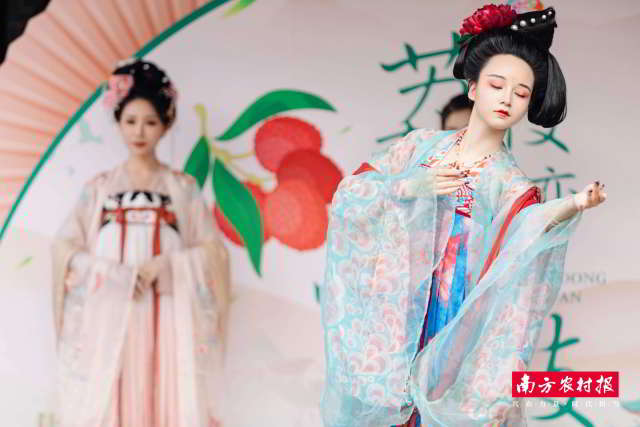 活动现场,嘉宾游客穿越千年,一场别开生面的古今对话点燃了现场的火热气氛。诗会上,身着宋制汉服的苏轼举杯邀众人尝荔枝酒、杨贵妃则烹荔枝茗茶相赠,观众以荔枝为主题与历史名人对诗,弘扬荔枝文化。
