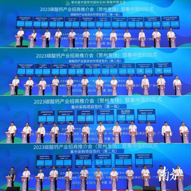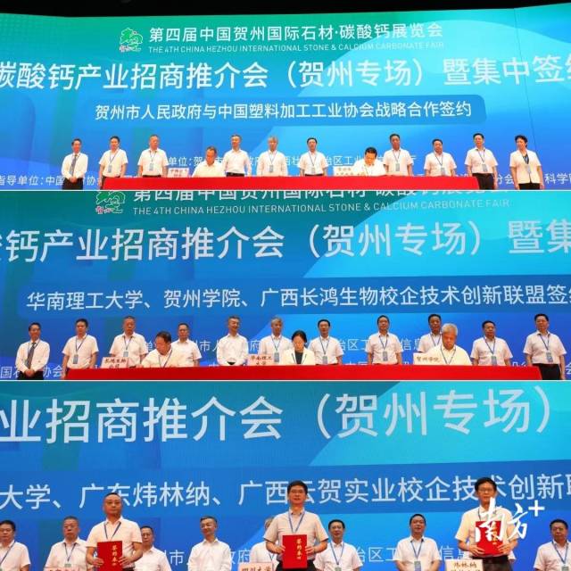 开幕式上还举办了一系列签约仪式。贺州市人民政府与中国塑料加工工业协会签订战略合作协议;华南理工大学与贺州学院、广西长鸿生物材料有限公司,四川大学与广东炜林纳新材料科技有限公司、广西云贺实业有限公司进行校企技术创新联盟签约,为碳酸钙高质量发展聚能赋能。19个碳酸钙产业投资合作项目集中签约,总投资达125亿元;12个碳酸钙产品集采项目集中签约,总采购额达38亿元。