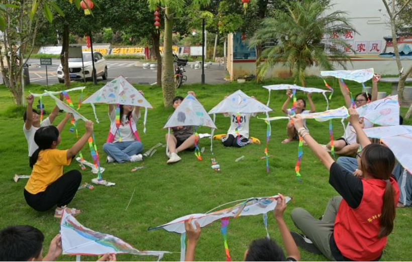 车村的变化,青少年们也看在眼里。他们用画笔在风筝上画下了家乡的模样,他们天马行空、大胆创新,展现出车村青少年儿童们丰富的想象力与活跃的思维能力。团队成员融入车村,和孩子们一同坐在草坪上尽情绘画,形成了车村一副特别的风景。听着统一的口令,所有人举起风筝朝太阳的方向奔跑,象征车村与梦想的风筝在空中随风翱翔。