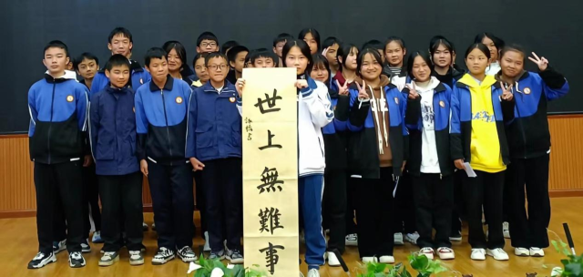 在运笔示范环节,来自广州市的两位学生代表执笔上场。随着笔尖在纸面游走,“久有凌云志”“世上无难事”几个大字赫然显现。同龄人的精彩示范,燃起了镇宁学生们的学习热情,在大山中种下一颗颗艺术教育的种子。