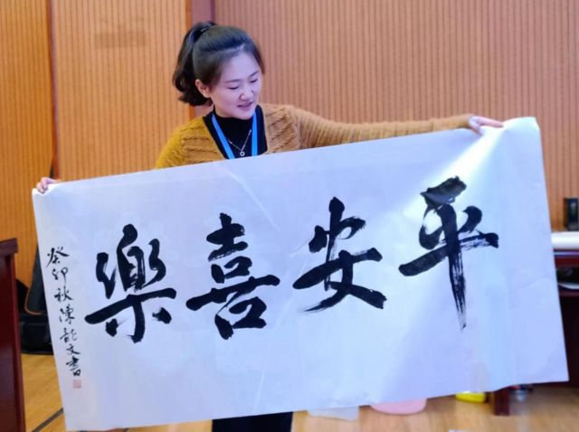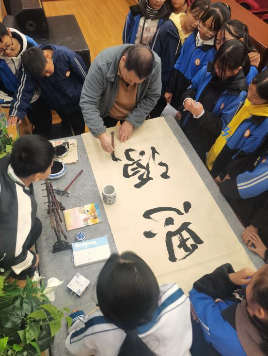 最后,陈龙文教授在场内挥毫泼墨,一横一竖落笔留香,一撇一捺凝气聚神,写下“饮水思源”“平安喜乐”“静能生慧”等勉励话语赠与镇宁师生。书法家挥洒自如的创作令在场众人叹为观止,纷纷临摹练习,为讲座画上圆满句号。