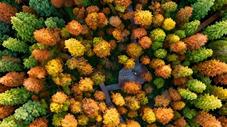 从起初的零星红叶在层林中点缀,到一团团金黄、橙红、橘红、深红渐渐在绿海中蔓延开来,绿托着红,红托着黄,彼此偎依,相互映衬......