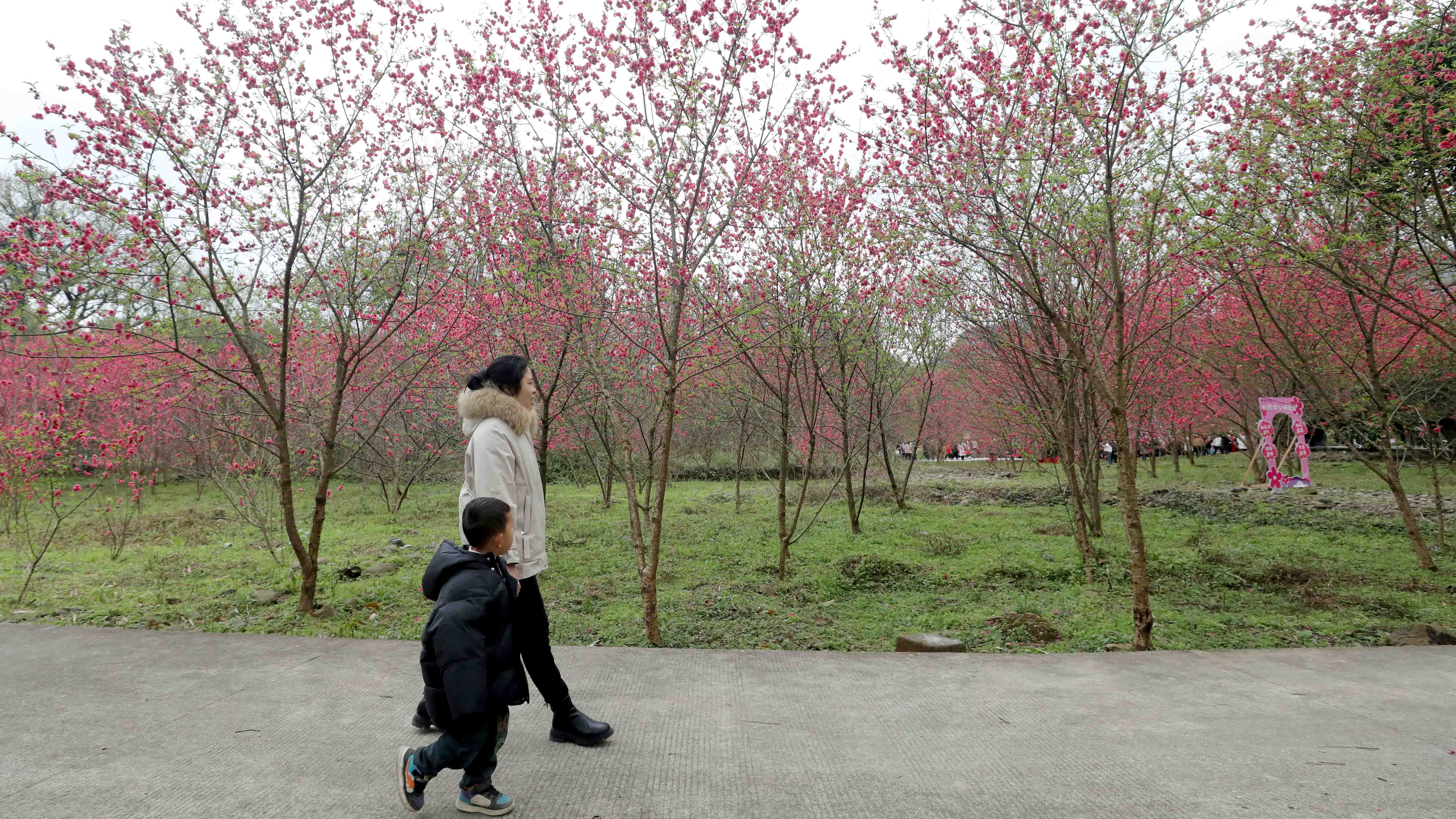2月25日,在广西柳州市融安县浮石镇东江村晚诺屯,游客带着小孩赏桃花美景。