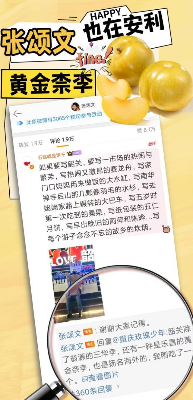 2024年7月,乐昌黄金柰李之夜文旅嘉年华举办,现在向全球征集乐昌黄金柰李主题曲。黄金柰李上市,受到的关注度如今不可同日而语。演员张颂文在推介韶关的微博下面评论,“还有一个乐昌的黄金柰李,也是扬名海外的,我刚吃了一个。”