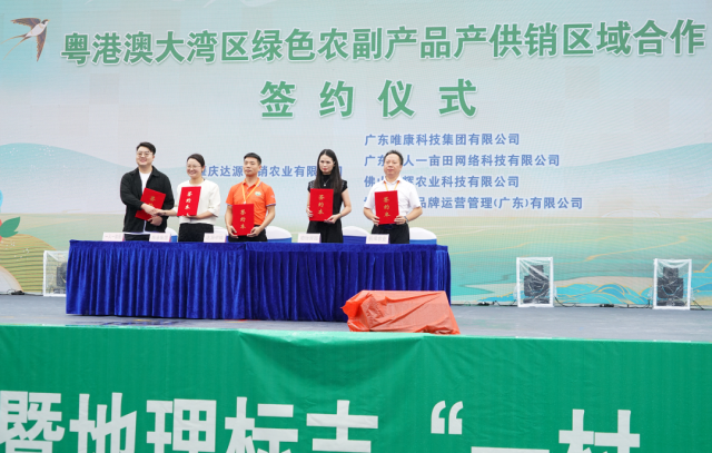 活动现场还举行粤港澳大湾区绿色农副产品产供销区域签约仪式、“怀集味道”区域公用品牌运营单位与连锁商超、餐饮、线上平台公司签订供销合作框架协议、金融助力“百千万工程”高质量发展授信签约仪式。其中,中国邮政储蓄银行、广东怀集农村商业银行股份有限公司、中国农业银行股份有限公司怀集县支行分别为怀集县绿色农副产品行业协会授信一亿元。