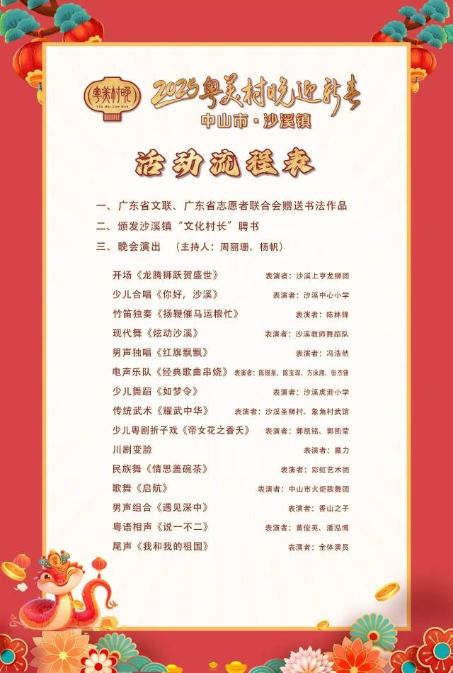 1月17日19:30,2025粤美村晚迎新春(中山市·沙溪镇)活动,将在沙溪镇新地标——滨河公园城市客厅隆重举行,这也是粤治·粤美“村晚”迎新春活动的第二场村晚表演。此次活动由广东省文学艺术界联合会、广东省志愿者联合会指导,中山市文学艺术界联合会、中山市沙溪镇人民政府主办,并得到多家单位的承办、协办与支持,旨在为广大群众带来一场丰富多彩的文艺演出,共庆新春佳节。