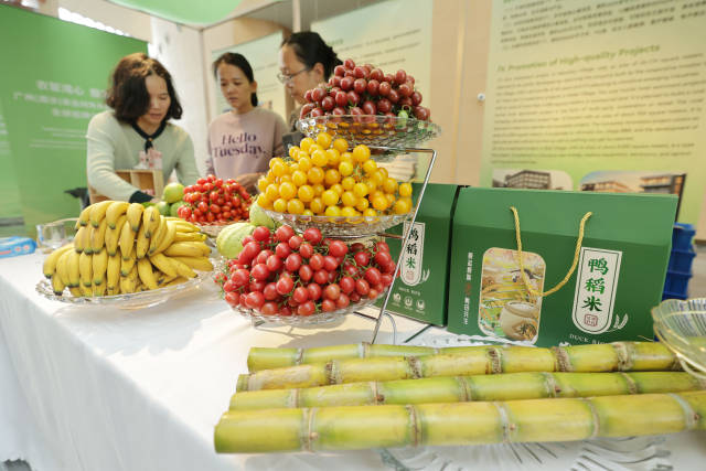 在南沙国际会展中心大厅中,记者提前探营各个档口布置:在南沙区特装展位中,特色农产品整齐地放在桌子上,其中既有莲藕、番石榴、佳丽蕉等农产品,也有穗粮丝苗米、一品粤糕饼和南沙港口车厘子、榴莲、椰青等产品。档口中还有专门的热带观赏鱼水族箱,里面将安放南沙产的特色观赏鱼、名优水产品,届时将为展会增添一抹亮色。在一旁的展板上,则详细地展示了南沙发展和农业建设成果。