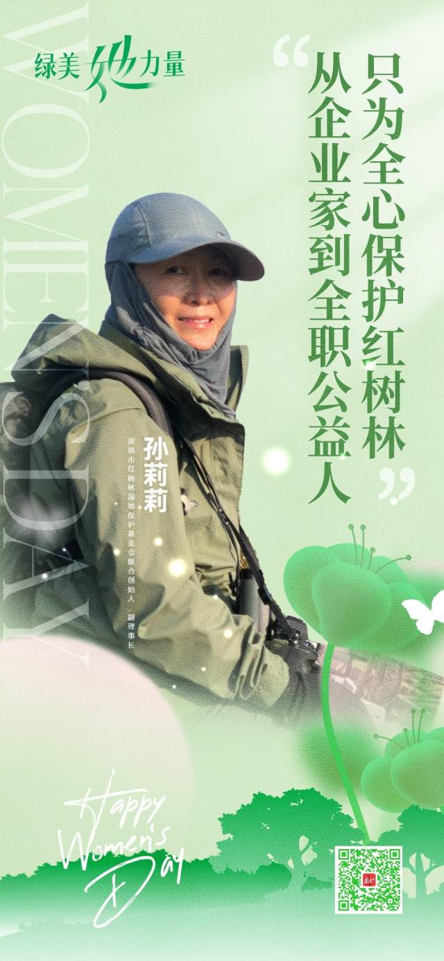从企业家到全职公益人,她将商业上的智慧注入红树林及生物多样性保护,用女性独有的坚韧与细腻推动公众参与红树林保护,共同讲述人与自然和谐共生的中国故事。