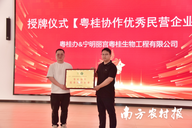 仪式上,宁明县授予宁明丽宫粤桂生物工程有限公司“粤桂茶匠孵化工作站”“粤桂协作优秀民营企业”“‘小个专’党建工作联系点”等称号,强化技术赋能与党建引领。陈月明表示,企业将依托粤桂协作机制,突破技术壁垒,打通市场链路,助力“一颗藤果富裕一方百姓”。