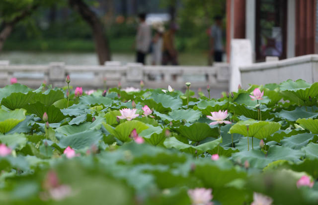 仲夏时分,剑英公园荷塘里,荷花相继绽放。大片碧绿的荷叶舒展着身躯,朵朵粉红、嫩白的荷花点缀其间,形成了一道亮丽的风景线。微风吹来,亭亭玉立于水中的荷花摇曳身姿,散发一阵阵淡淡的花香,沁人心脾、令人沉醉。