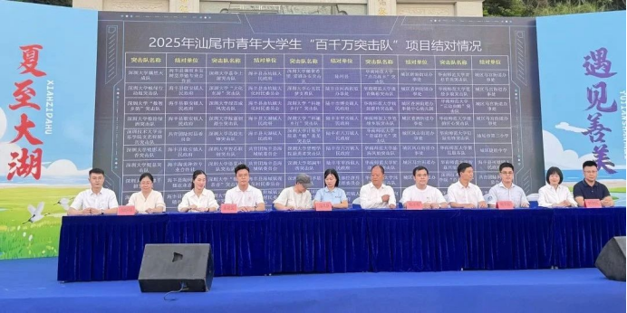 仪式现场,一项重要的环节备受瞩目,6 个县区代表与对接高校突击队代表签署 “项目结对书”。汕尾市城区、海丰县、陆丰市、陆河县、红海湾经济开发区、华侨管理区的代表们,与来自各大高校的突击队代表们,郑重地在结对书上签下自己的名字。这一笔一划,不仅是一份承诺,更是校地双方携手共进、助力乡村发展的决心。签约完成后,双方代表紧紧握手,脸上洋溢着对未来的憧憬。青年大学生 “百千万工程” 突击队代表昂首挺胸,发出了铿锵有力的青春宣言:“我们将以青春之我,创建青春之乡村,扎根基层,奉献自我,为‘百千万工程’贡献青春力量!” 他们的话语掷地有声,表达了新时代青年扎根乡村、服务奉献的坚定信念,深深感染了在场的每一个人。