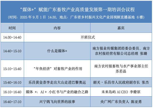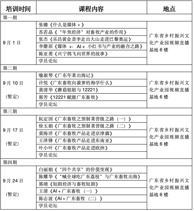 特别强调,以上课程仅仅是第一期!“媒体+”广东畜牧业高质量发展培训计划组织开展总共四期、20个课时的系列专题培训,内容围绕理念开篇、跨界借鉴、案例穿插、话题创新、赛道延伸、媒介融合、价值升华、总结互动八大核心主题,后续还有三期内容同样看点满满!让“媒体+”为畜牧产业高质量发展插上腾飞的翅膀,助力广东畜牧走向全国、飞向全球!