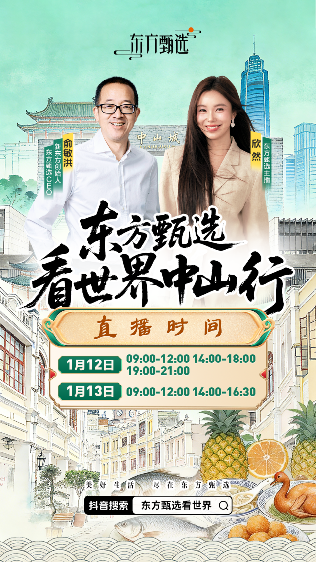 近日,东方甄选官方公布,俞敏洪、主播欣然将于1月12日至13日走进中山,沉浸式体验、推荐中山好物与文化,并通过东方甄选App、抖音“东方甄选看世界”双平台同步开播。“中山香农”多个品牌产品将在直播间亮相。