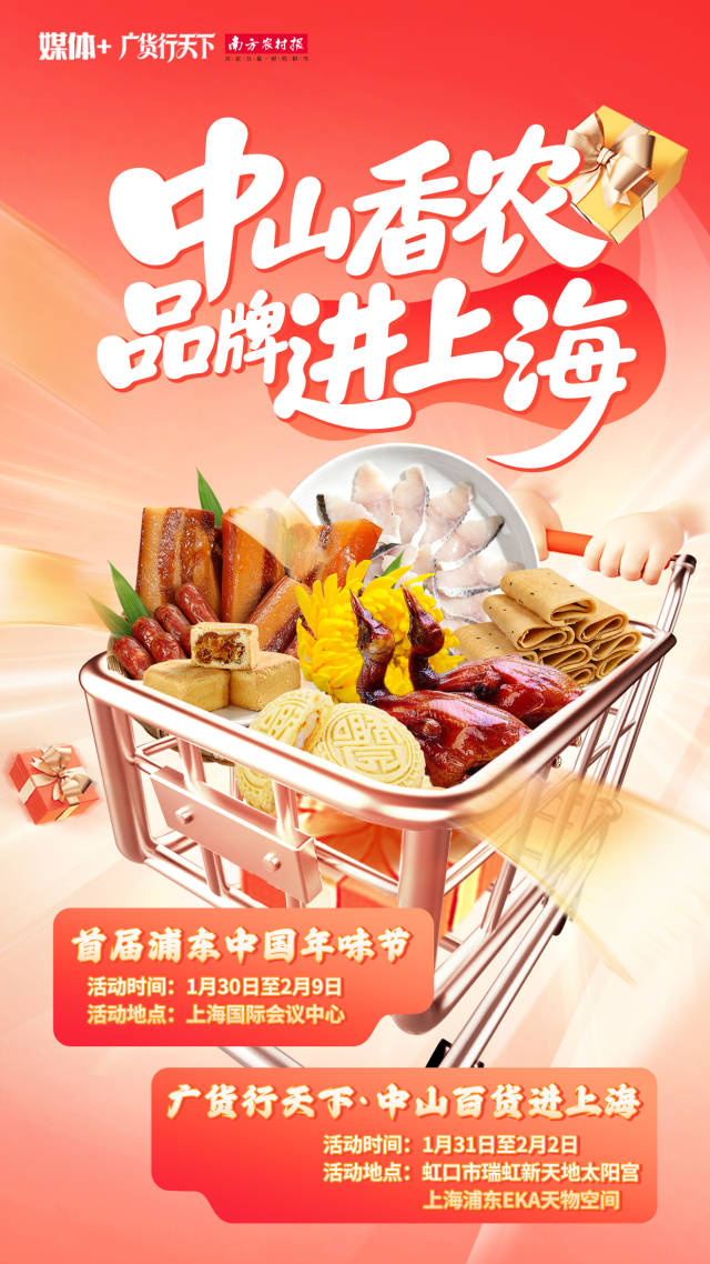 上海的朋友,你们的“年味雷达”该响了!中山的黄圃腊味、小榄脆肉鲩、非遗杏仁饼…即将组团“空降”上海!1月30日至2月9日,“中山香农”品牌将亮相首届浦东中国年味节,此外在1月31日至2月2日期间,品牌还将同步参与“广货行天下,中山百货进上海”推广活动。岭南年味、限定福袋、免费试吃…快来赴约吧!
