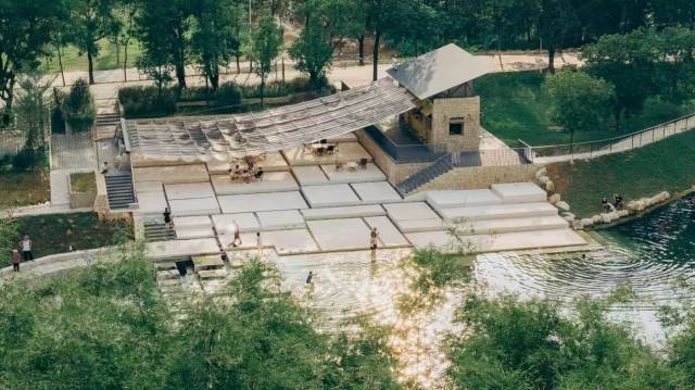该驿站以多孔混凝土打造环形建筑,依托下沉广场与漂浮平台打造双重标高景框,实现临河观山的多元观景体验,下层可团坐休憩,上层可漫步赏景,形成层次丰富、意境深远的观景效果;艺术装置“下浪大幕”秉持取之于场地、用之于场地的建造运营理念,将东坡诗意与自然肌理巧妙融合,成为新春文旅打卡的热门地标。