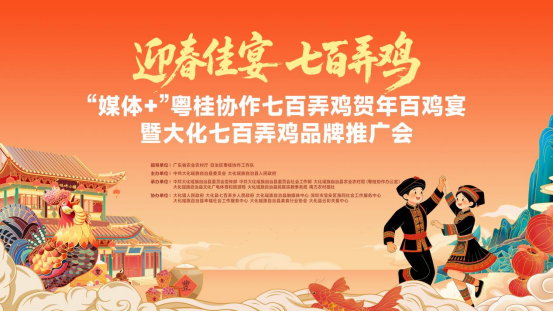 迎春佳宴,七百弄鸡。2月8日,“媒体+”粤桂协作“七百弄鸡”贺年百鸡宴暨大化七百弄鸡品牌推广会活动,将在大化瑶族自治县古江社区达吽小镇广场热力启幕。这场集 “产业秀、文化潮、民生乐” 于一体的新春盛会,既要让七百弄鸡的鲜香飘向全国,更要让粤桂协作的温情温暖整个春节。