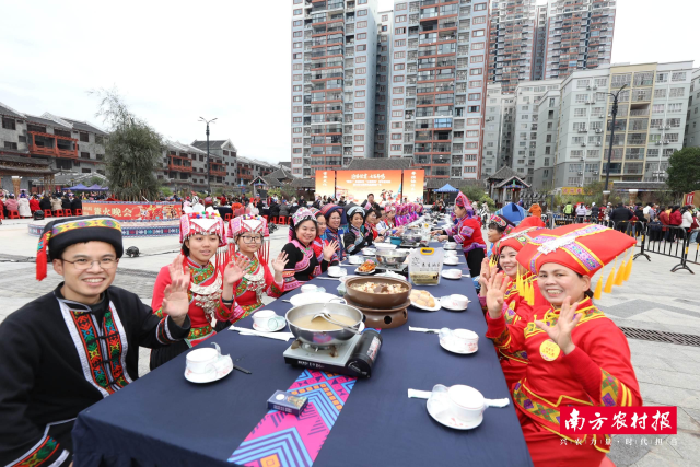 白切鸡皮爽肉嫩、七百弄鸡汤温润醇厚、涮鸡肉片鲜滑弹牙……近40道以七百弄鸡为核心、搭配大化生态食材的佳肴相继呈上,香气弥漫,引人食指大动。宴席方酣,篝火燃起。熊熊火光映照着一张张笑脸,瑶族同胞与粤桂来宾手拉手,围着篝火踏歌起舞,悠扬的山歌与欢快的笑声汇成一片。