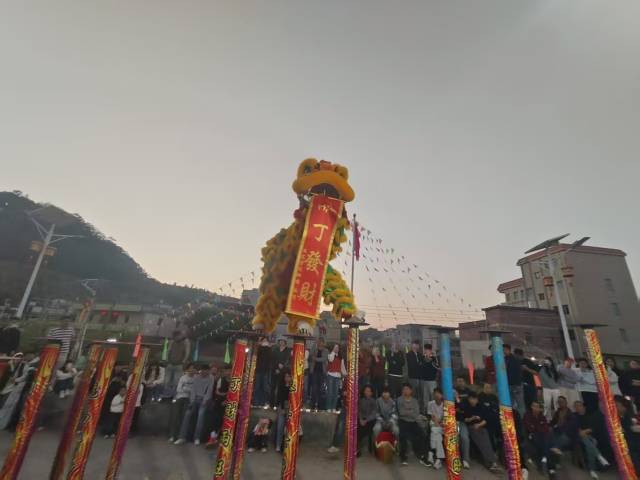 下午4时,汤二村下老屋禾坪上锣鼓喧天,人流如织。伴随着激昂的鼓点,一条锦色长龙在男儿们的挥舞下翻腾穿梭,时而昂首啸天,时而俯身探海,“舞龙跳凳”表演更是将力量与技巧完美结合,展现了客家男儿刚毅勇猛的精神风貌。霞光映照在祠堂上,金色的醒狮腾空跃起,鳞片闪闪发亮,鼓声响起,狮子轻跃而上,在高低错落的桩阵间游走,灵活的动作引得满堂喝彩,将现场气氛推向了高潮。精彩的龙狮表演不仅“唤醒”了村庄的年味,更拉开了当天民俗盛宴的序幕。