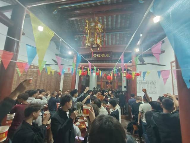 随着夜幕降临,华灯初上,活动进入了最温情的环节——福乐晚宴。在祠堂里,十余张八仙桌整齐排开,热气腾腾的客家酿豆腐、红焖肉等传统菜肴接连上桌。