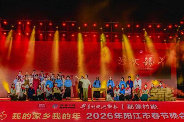 骏马乘春至,福门开新篇。2月21日,大年初五,华灯初上,阳江市江城区埠场镇那蓬村张灯结彩、人声鼎沸。这里是岭南画派大师关山月的故里,“春到漠阳·我的家乡我的年”2026年阳江市春节晚会在此温情上演。晚会由广东省委社会工作部、省文联等单位指导,阳江市委社会工作部、市文联、江城区委宣传部、阳江一中校友会主办。4500余名乡亲、校友和各界嘉宾齐聚一堂,在家门口共享文化盛宴,共叙乡情年味。