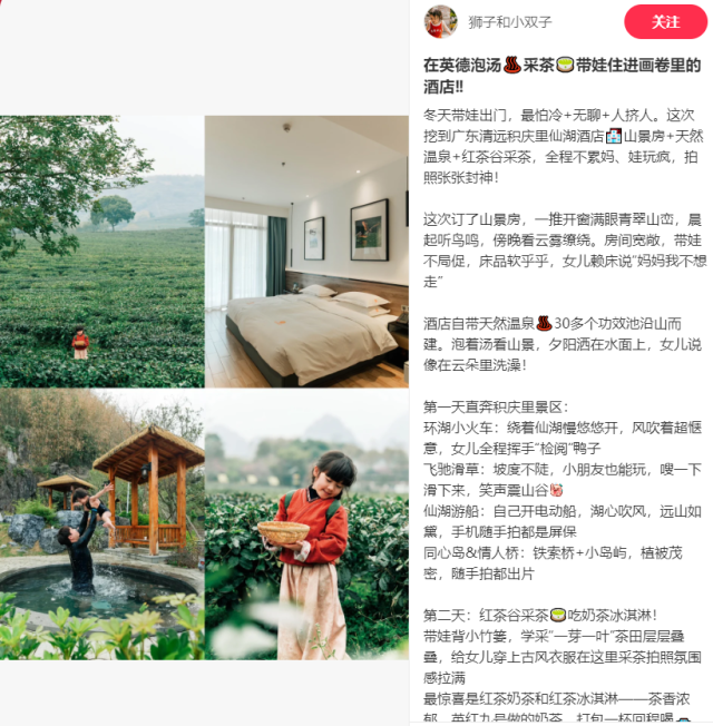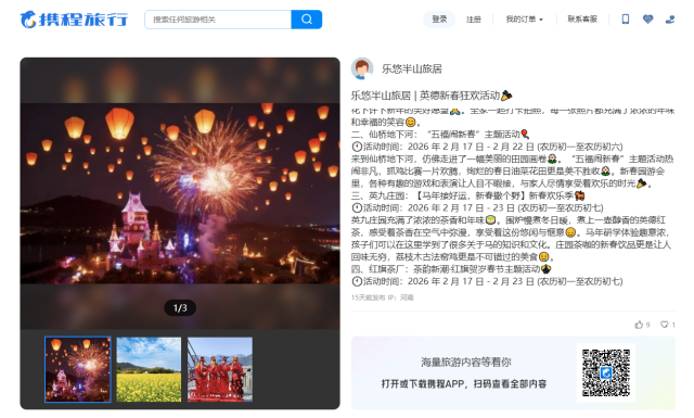 携程用户在体验后分享,在英九庄园的油菜花田旁围炉煮茶,捧一杯醇厚的英德红茶,看漫山金黄缀满茶田,搭配香气扑鼻的荔枝木古法窑鸡,“茶香混着花香、肉香,既有新春的热闹年味,也有田园的野趣诗意”。不少亲子家庭表示,孩子们在庄园里参与马年研学体验,在学习马文化的同时,亲身感受古法制茶的乐趣,不仅收获了知识,更留下了难忘的新春回忆,“这是一次既有年味又有收获的亲子之旅”。