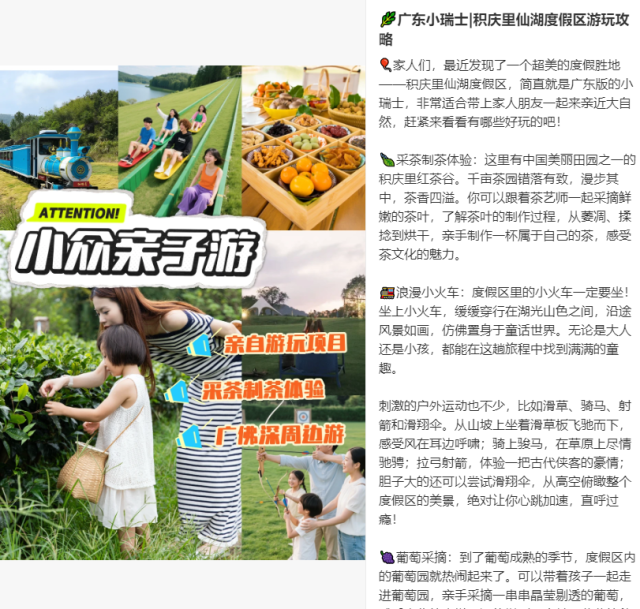 带着孩子穿梭在层层叠叠的茶田间,背着小竹篓学习采摘“一芽一叶”的鲜嫩茶青,搭配古风服饰拍照,氛围感十足;景区内的环湖小火车、天然温泉等设施,更让全家老少都能卸下疲惫,享受悠闲惬意的度假时光。“最惊喜的是这里的红茶奶茶和红茶冰淇淋,以正宗英红九号为原料制作,茶香醇厚、口感清甜,打包一杯回程,余味悠长”。
