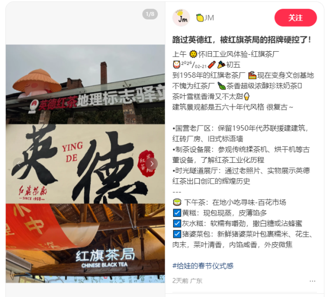 作为英德红茶的发源地,拥有近70年历史的红旗茶厂,在春节期间以“茶韵新潮・红旗贺岁”为主题,依托国家级工业遗产的独特魅力,吸引近10万游客慕名到访,成为英德茶旅打卡的“顶流”景区。