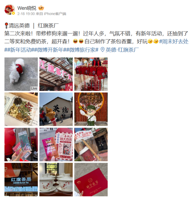 微博用户@wen晓悦在春节打卡后表示,景区内年味浓郁、人气爆棚,参与NPC民俗互动游戏不仅抽到了二等奖,还免费兑换了奶茶,亲手制作的茶包香薰更成为极具纪念意义的新春伴手礼,“好玩又有温度,沉浸式感受到了老茶厂的新潮年味”。