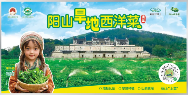 田埂上的“国字号”,好菜从粤北直达湾区餐桌。粤味珍品·阳山旱地西洋菜的海报格外清新。抱着西洋菜的IP形象“菜小西”,身后是连片的绿色菜田与古色古香的阳山古村,标注着“地标认证、旱地种植、山泉喷灌”的字样。