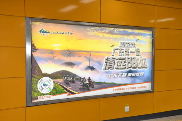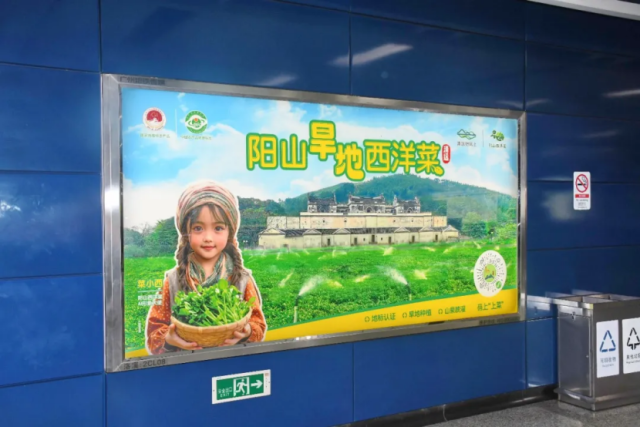 从广州南站到增城广场,从纪念堂到体育西路,我们的阳山主题海报和品牌列车,已在这条日均客流量超百万的线路上全线亮相。无论是站厅里的大幅灯箱,还是车厢内的创意贴画,都在向每一位乘客讲述阳山的故事:一边是绿意盎然的西洋菜田,西洋菜IP形象捧着脆嫩的粤味珍品·阳山旱地西洋菜,把国家地理标志产品的清甜,送到了大湾区的家门口;另一边是海拔1902米的广东第一峰,云海翻涌、风车转动,“广东天路”的骑行画面,邀请大家奔赴一场云端自驾之旅。
