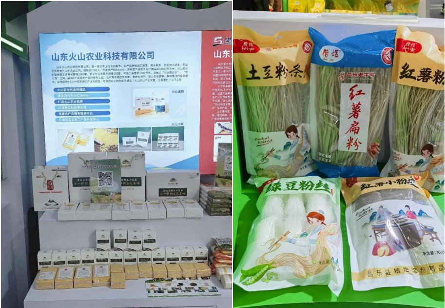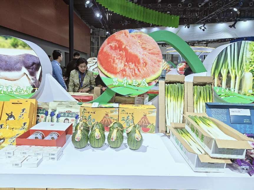 昌乐县此次展出的农产品种类丰富,各具特色。“火山小米”因其生长在火山灰土壤中而得名,以其独特的风味和营养价值受到消费者的喜爱。西瓜是潍坊昌乐县的传统特色优势产业,昌乐西瓜有1000多年种植历史,以其早熟、皮薄、沙瓤、脆甜的特点闻名,以47.85亿元的品牌价值连续14年位居全国西瓜第一品牌,也带动了目前整个全县西瓜种植面积达到16万亩,产值实现了24个亿,成为昌乐农业的第一支柱产业,带动了“1+N”特色产业体系的发展。此外,芋头、洋葱、大蒜、贝贝南瓜、地瓜和山药等特色农产品,以其新鲜、绿色和健康的特点受到消费者的青睐。